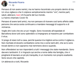 È stato proprio Riccardo Ficarra, sul suo profilo Facebook, a rassicurare i suoi amici con un toccante post: