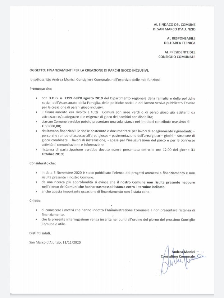 Lo scrive sulla sua pagina Facebook, il consigliere indipendente di San Marco d’Alunzio, Andrea Monici, in merito al mancato finanziamento del progetto per la realizzazione di un parco giochi inclusivo nel piccolo Comune dei Nebrodi.