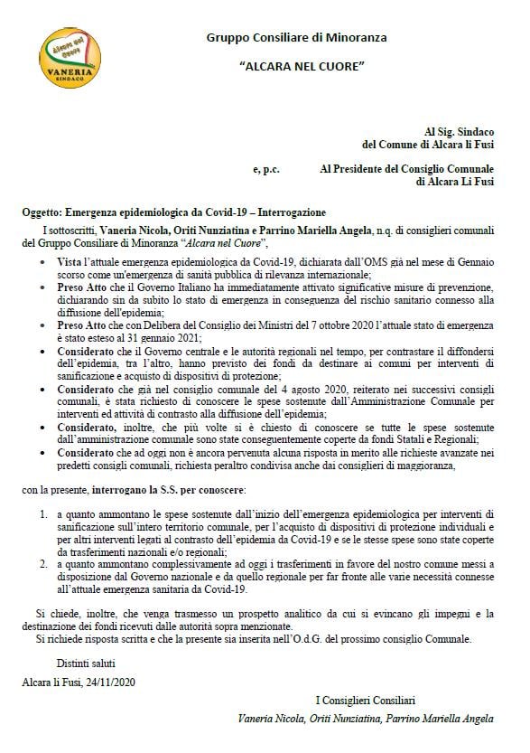 A domandarselo, in un’interrogazione presentata in Consiglio comunale e che sarà discussa nella prossima riunione del consesso civico, sono i consiglieri comunali di opposizione Nicola Vaneria, Mariella Angela Parrino e Nunziatina Oriti, del gruppo “Alcara nel Cuore”, che intendono sapere dal sindaco Ettore Dottore di conoscere a quanto ammontano complessivamente ad oggi i trasferimenti in favore del piccolo Comune dei Nebrodi messi a disposizione dal Governo nazionale e da quello regionale per far fronte alle varie necessità connesse all’attuale emergenza sanitaria da Covid-19.