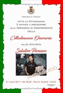La città di Capizzi, il prossimo 21 luglio, consegnerà la cittadinanza onoraria allo stilista Salvatore Parasuco. Riconoscimento conferitogli “non solo per il vincolo affettivo e familiare che lo lega al paese nebroideo ma, soprattutto, per il suo talento, tradotto in veri e propri manufatti tra sciccheria e raffinatezza”.