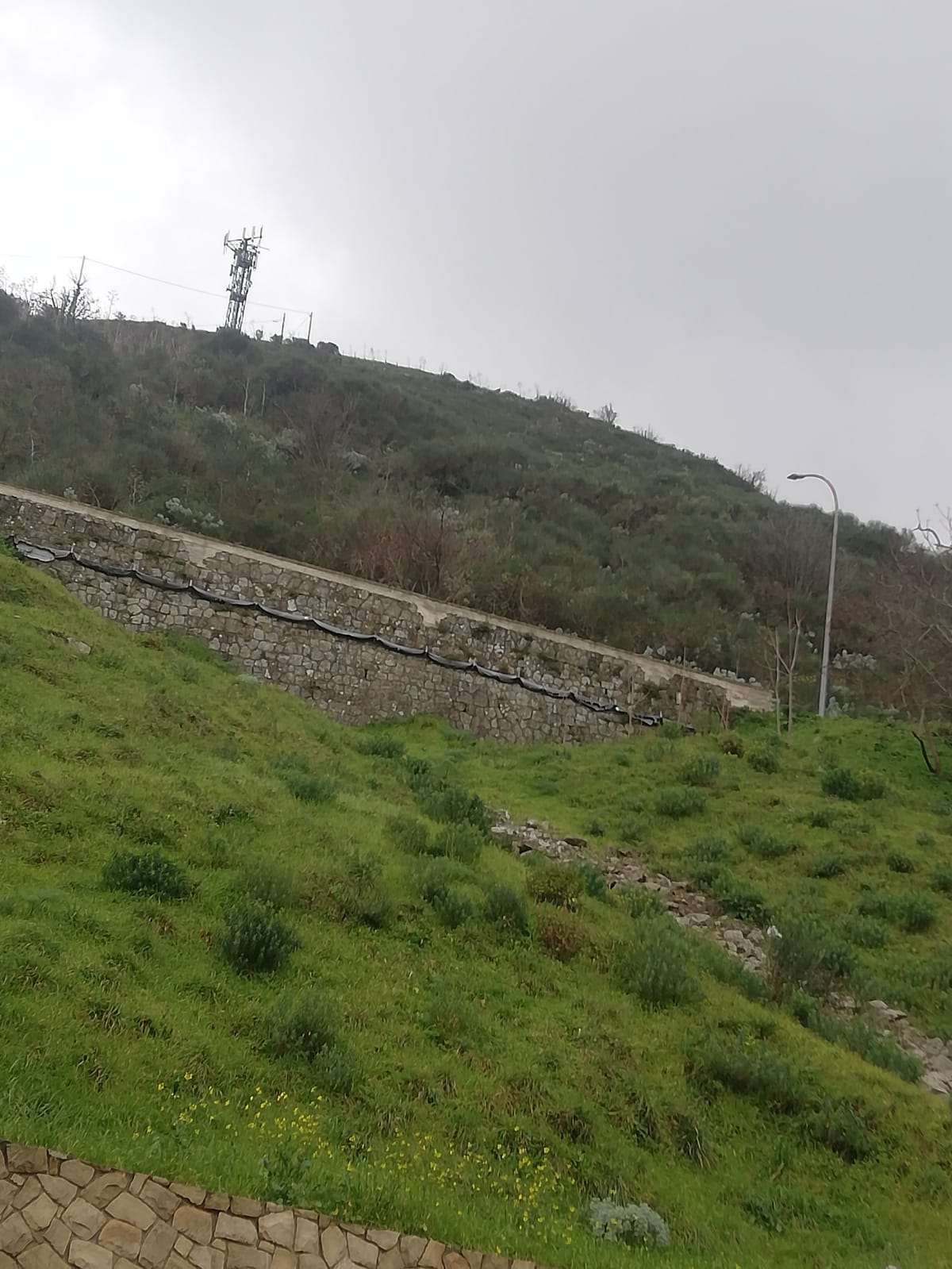 Gli interventi sul versante prevedono la realizzazione di una paratia con tiranti di pali disposti in linea per bloccare lo scivolamento verso il basso di massi lapidei, il rivestimento della porzione di paratia fuori terra con pietra locale, la regimentazione delle acque di ruscellamento superficiale mediante il drenaggio dell’intera area.