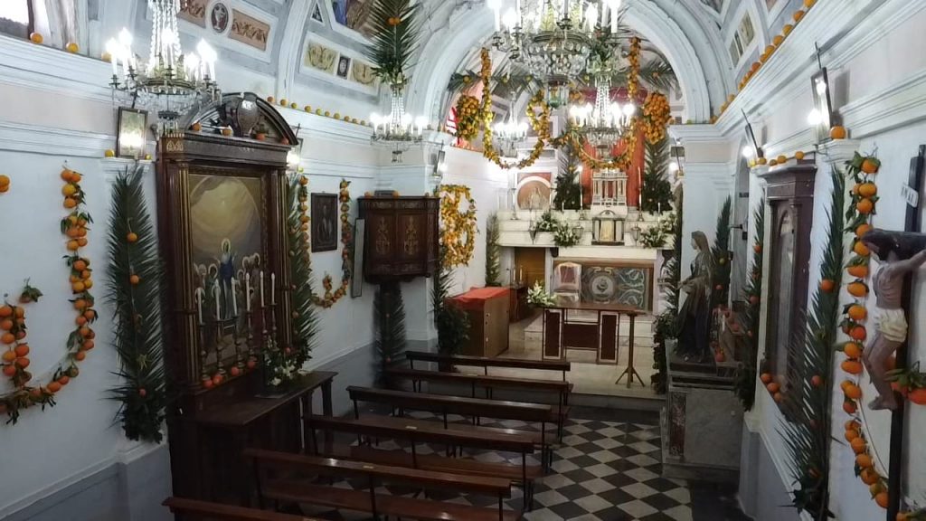 Tutto pronto per l’inizio delle Quarantore, a Castel di Lucio. Spazzati gli ultimi residui del Carnevale paesano, è veloce per la comunità il passaggio dall’euforia al raccoglimento, nel percorso picchettato di palme, alloro e arance, che dalla Chiesa Madre, in Piazza Umberto I, conduce alla chiesetta di San Carlo, edificata nella prima metà del XVII secolo, e che al suo interno custodisce il dipinto settecentesco di Nicolò Di Salvo, dell’omonimo santo, ritratto in atto penitenziale durante la peste di Milano.