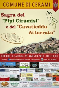 Sabato 25 Agosto a Cerami si rinnova l’appuntamento con la tradizionale Sagra dei prodotti tipici locali: u “Pipi Ciramisi” e il “Cavatìeddu Atturratu”. La manifestazione, a cura di diverse Associazioni Culturali, Sportive e di Volontariato, attive nel paese nebroideo e patrocinata dal Comune, si svolgerà a partire dalle ore 18.00 nel centrale Corso Roma.