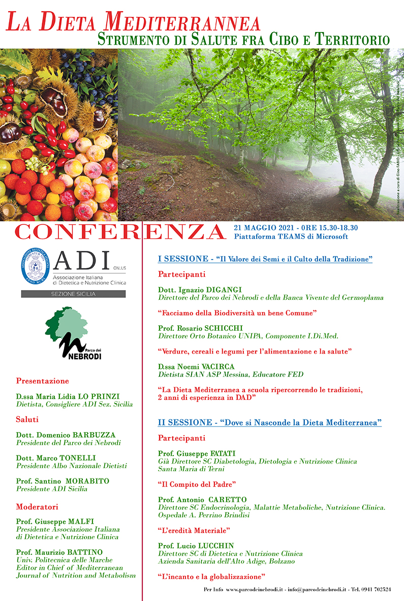 Con una conferenza organizzata on line per il prossimo 21 maggio, a partire dalle 15.30, prende ufficialmente il via l’azione di educazione alimentare nata dal protocollo sottoscritto tra il Parco dei Nebrodi, il Consorzio della Banca Vivente del Germoplasma vegetale dei Nebrodi e l’Associazione Italiana di Dietetica e Nutrizione Clinica.