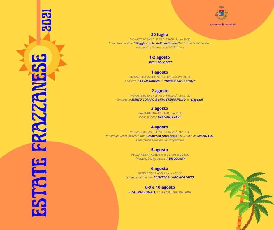 A Frazzanò è stato reso noto il cartellone degli eventi dell’estate 2021. “Nonostante il periodo che stiamo vivendo – scrivono sulla pagina Facebook gli amministratori locali – abbiamo cercato di fare qualche piccolo evento per animare un pò le serate estive. Buona estate a tutti da parte del Sindaco e di tutta l’amministrazione comunale”.