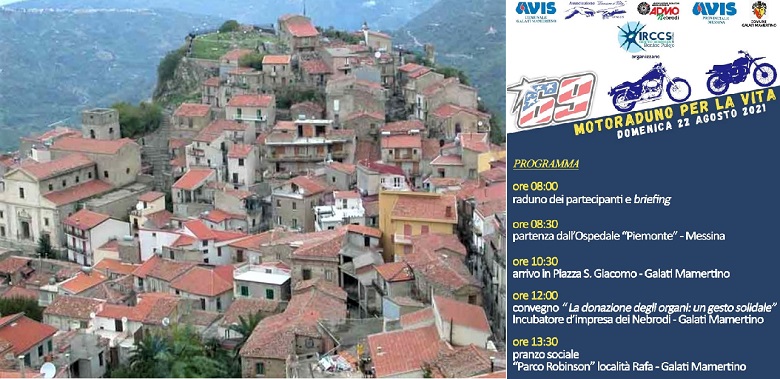 L’IRCCS Centro Neurolesi “Bonino Pulejo” di Messina, in collaborazione con Avis Sezione Provinciale di Messina, Admo Sezione Nebrodi e Associazione “Donare è Vita”, organizza una giornata di sensibilizzazione alla donazione di organi, tessuti, cellule, emoderivati e midollo osseo presso il Comune di Galati Mamertino – che patrocinerà l’evento- attraverso un motoraduno che si terrà domani, domenica 22 agosto.