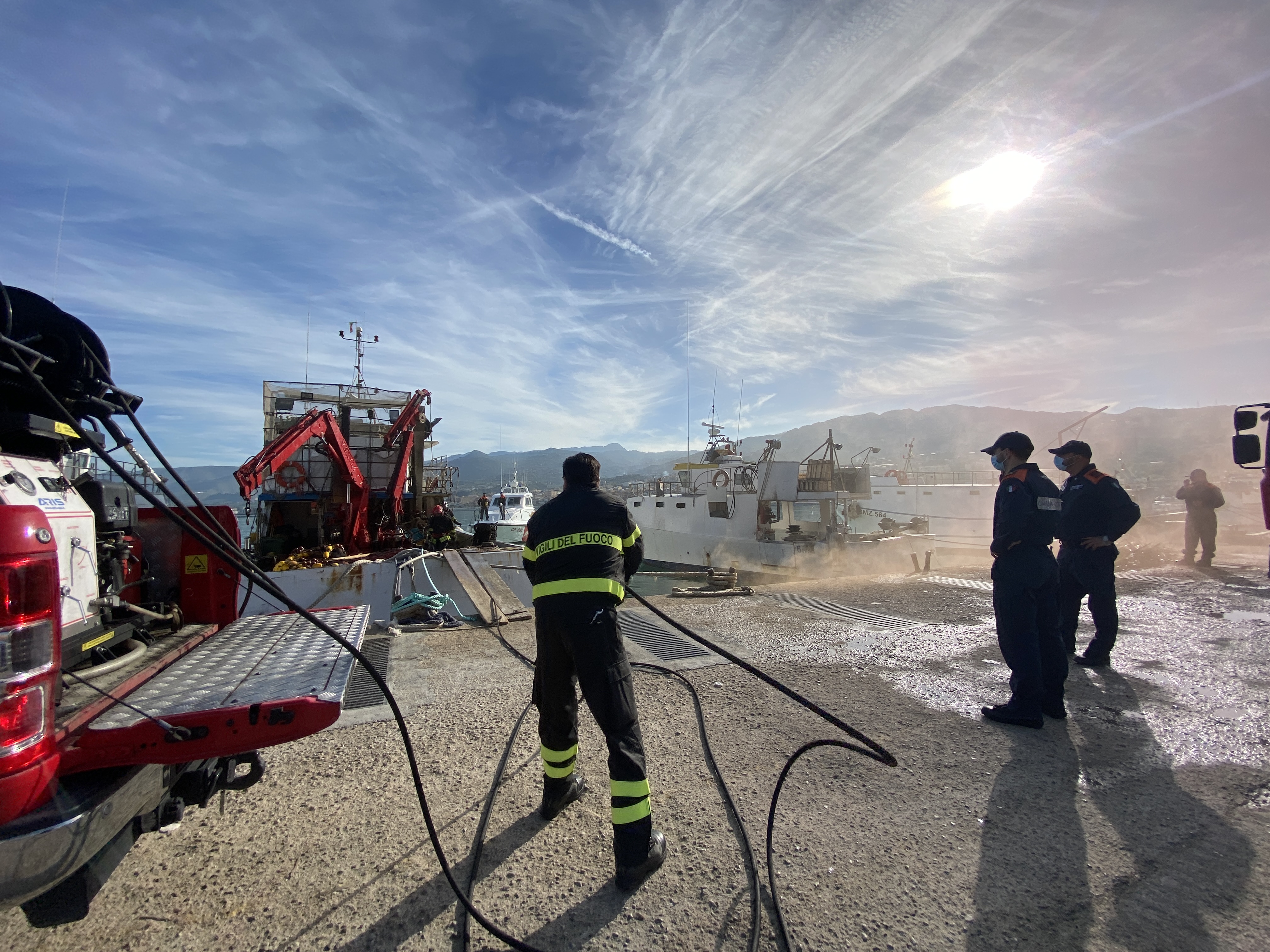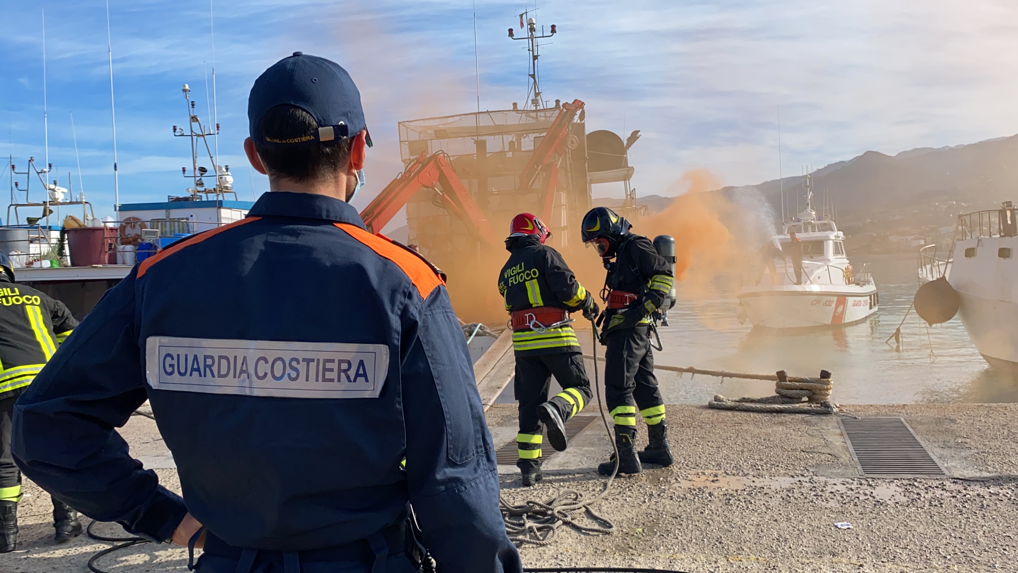 Incendio su un peschereccio, esercitazione al porto di Sant’Agata
