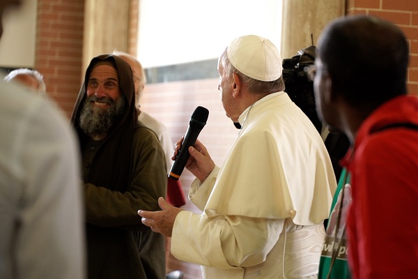 Quando arriva papa Francesco – documenta l’allievo del corso di Reportage – la prima cosa che fa è abbracciare Biagio e poi accompagnato da un coro “papa Francesco, papa Francesco!” Entra in mensa: per il papa è stato disposto orizzontalmente un lungo tavolo che domina tutta la sala in cui sono sparse altre tavolate. Dopo aver salutato tutte le persone sedute accanto a lui, il Santo Padre si siede al centro. L’immagine ricorda l’ultima cena di Leonardo anche se le persone sono sedute in tutto il perimetro del tavolo e viene quasi difficile scorgere l’immagine del papa. Dopo aver ringraziato i presenti per la calorosa accoglienza il papa augura a tutti: “Buon pranzo!” Francois è seduto alla sua sinistra e il suo volto emana una gioia indescrivibile.