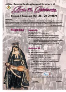 La comunità di Torrenova si prepara per i solenni festeggiamenti di sabato 28 e domenica 29 ottobre, in onore di Maria SS. Addolorata venerata come Protettrice. Anche quest’anno, il programma che scandisce i festeggiamenti, stilato dal comitato, con il prezioso contributo del parroco padre Maurizio Provenzale e con il patrocinio del Comune, si presenta ricco di momenti religiosi e ricreativi organizzati per preparare i fedeli a vivere nel migliore dei modi i giorni della festa.