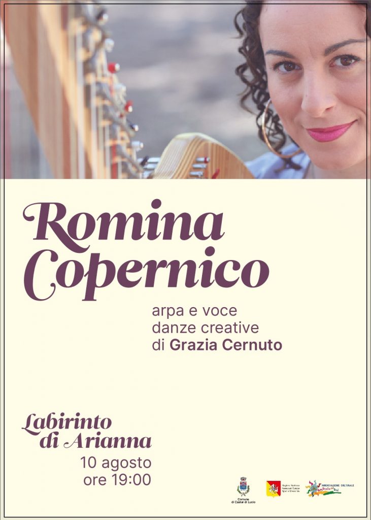 Un percorso della bellezza e delle emozioni che si snoda dal Labirinto di Arianna al cuore pulsante del piccolo borgo nebroideo. Gli eventi organizzati dall’Associazione Culturale Stelle del Sud con il patrocinio della Regione Siciliana Assessorato Turismo Sport e Spettacolo, dal Comune di Castel di Lucio e sostenuti dalla sede locale di SiciliAntica Cefalù, vedranno Romina Copernico, arpista e cantante e Grazia Cernuto, autrice di danze creative, esibirsi martedì 10 alle ore 19 presso il Labirinto di Arianna, una delle opere di Land Art volute dal mecenate Antonio Presti.