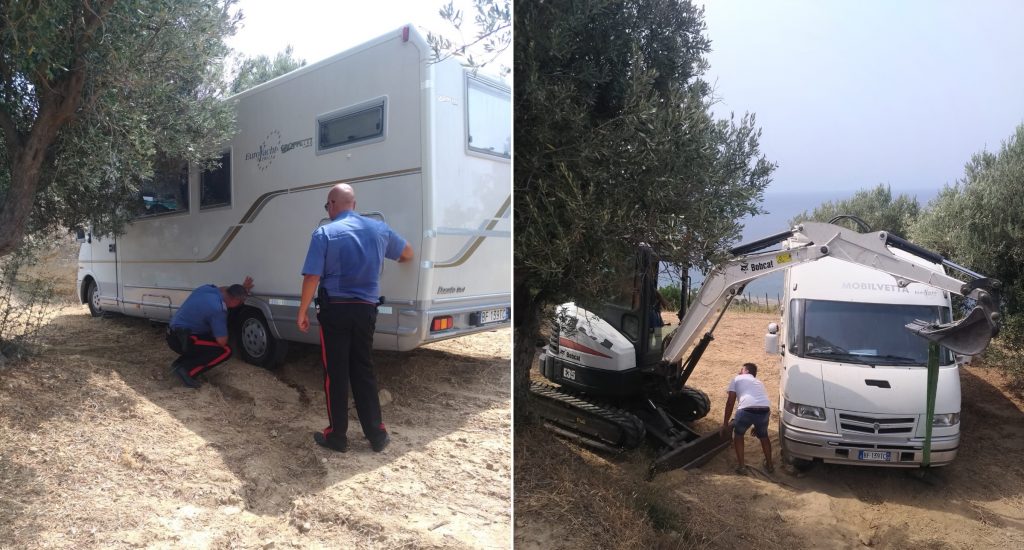 Sul posto i carabinieri della locale stazione agli ordini del maresciallo Francesco Perri. Giunti sul posto gli uomini dell’Arma, dopo essersi accertati delle condizioni di salute degli sfortunati viaggiatori, si mettono in contatto con un hotel della zona dove faranno accompagnare la giovane mamma e le due bambine, provate sia fisicamente che mentalmente, e contattano la ditta Bruno di Pettineo alla quale chiedono aiuto per liberare il mezzo. Il titolare dell’impresa si mostra subito disponibile e invia sul posto un piccolo escavatore grazie all’intervento del quale viene liberato il camper e rimesso sulla stradina di campagna.