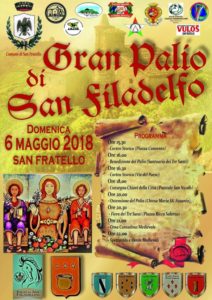 Domenica 6 maggio 2018, si terrà a San Fratello il ‘Gran Palio di San Filadelfo’. Dalle fonti storiche nasce l’idea di organizzare la rievocazione storica e il corteo della venuta del Gran Conte Ruggero Normanno e della Nobilissima Aleramica Adelaide del Vasto, che portano in dono a Roberto De’ Caldarera, capo della colonia lombarda di San Filadelfio, il drappo raffigurate i Tre Santi Philadelphi e la promesso della costruzione del ‘ Castrum Sancti Philadelphi’. In onore dei Reggenti, il capo della colonia Lombarda indisse festeggiamenti con sfilate, giostre, sagre e palio delle contrade, nel mese di Agosto.