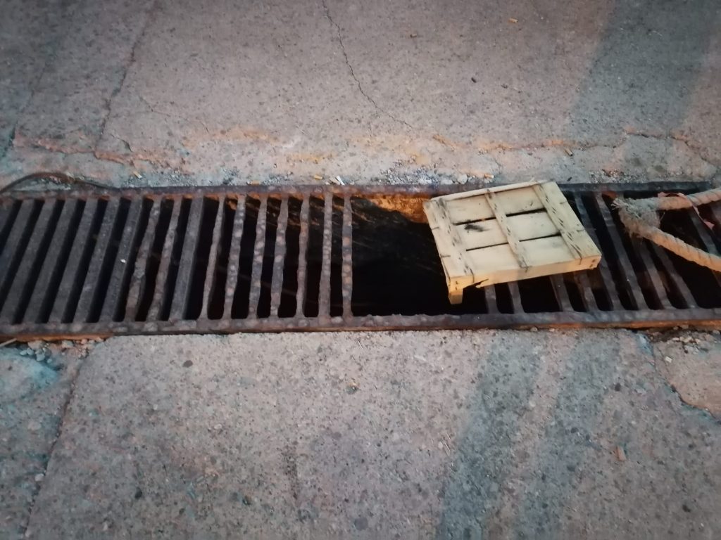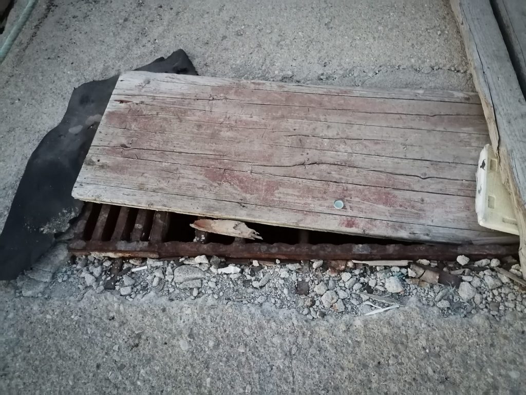 Tavole e cassette in legno non sono di certo i mezzi più efficaci per coprire i pozzetti e le caditoie rimaste senza tombini. Eppure si è fatto ricorso a questi grossolani rattoppi per metterli in sicurezza.