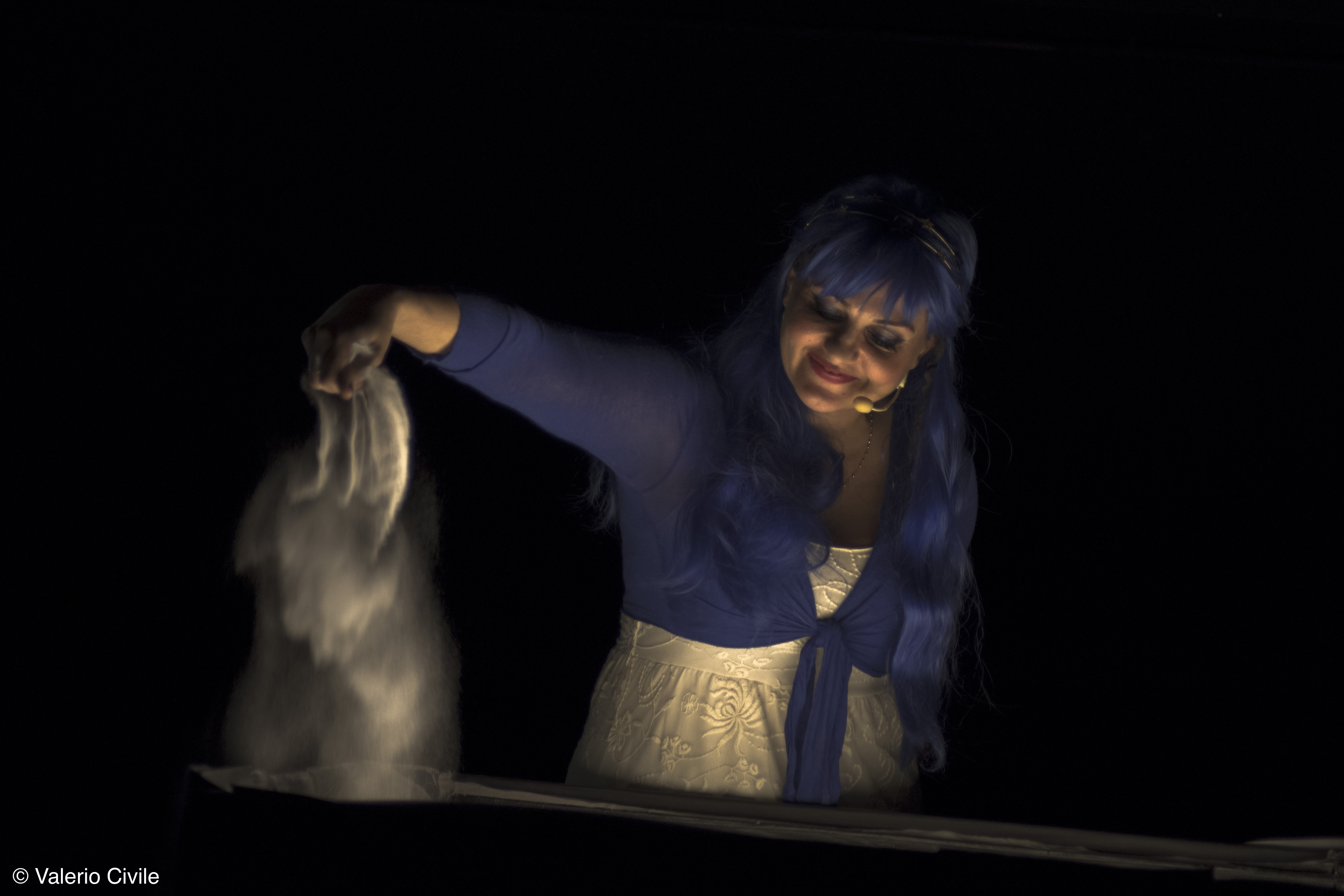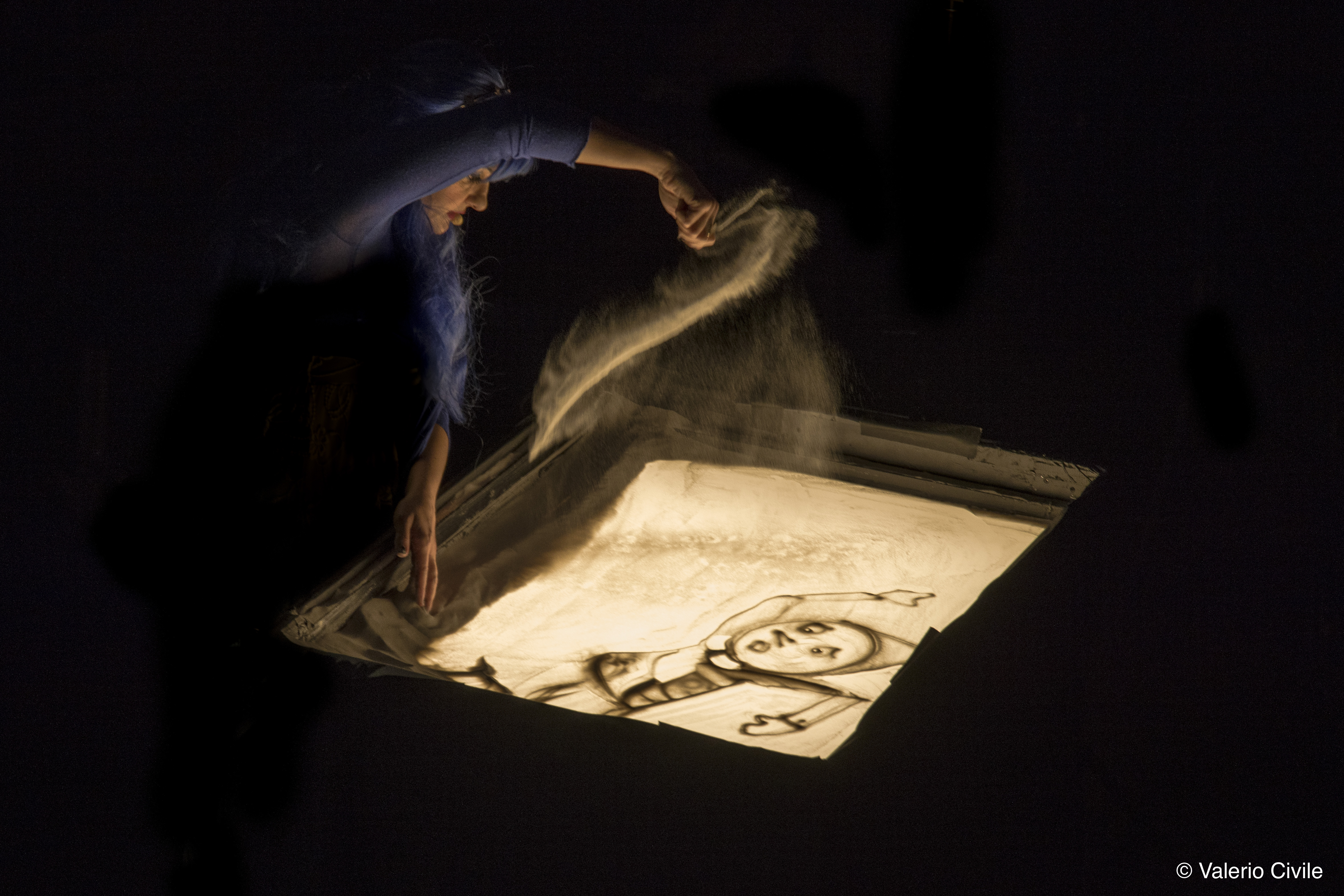 Fata Turchina e voce narrante, ha catturato la platea, a sala piena, fin dalle prime battute, mentre la lavagna luminosa alle sue spalle prendeva vita grazie ai suoi disegni realizzati con la sabbia in gesti eleganti e sicuri, scanditi dal ritmo di voce e musica. La scelta delle immagini ha sintetizzato perfettamente il racconto e ha condotto il pubblico in un crescendo di emozioni, senza un attimo di pausa, con la trasformazione da un quadro all’altro svolta sapientemente in grande velocità.