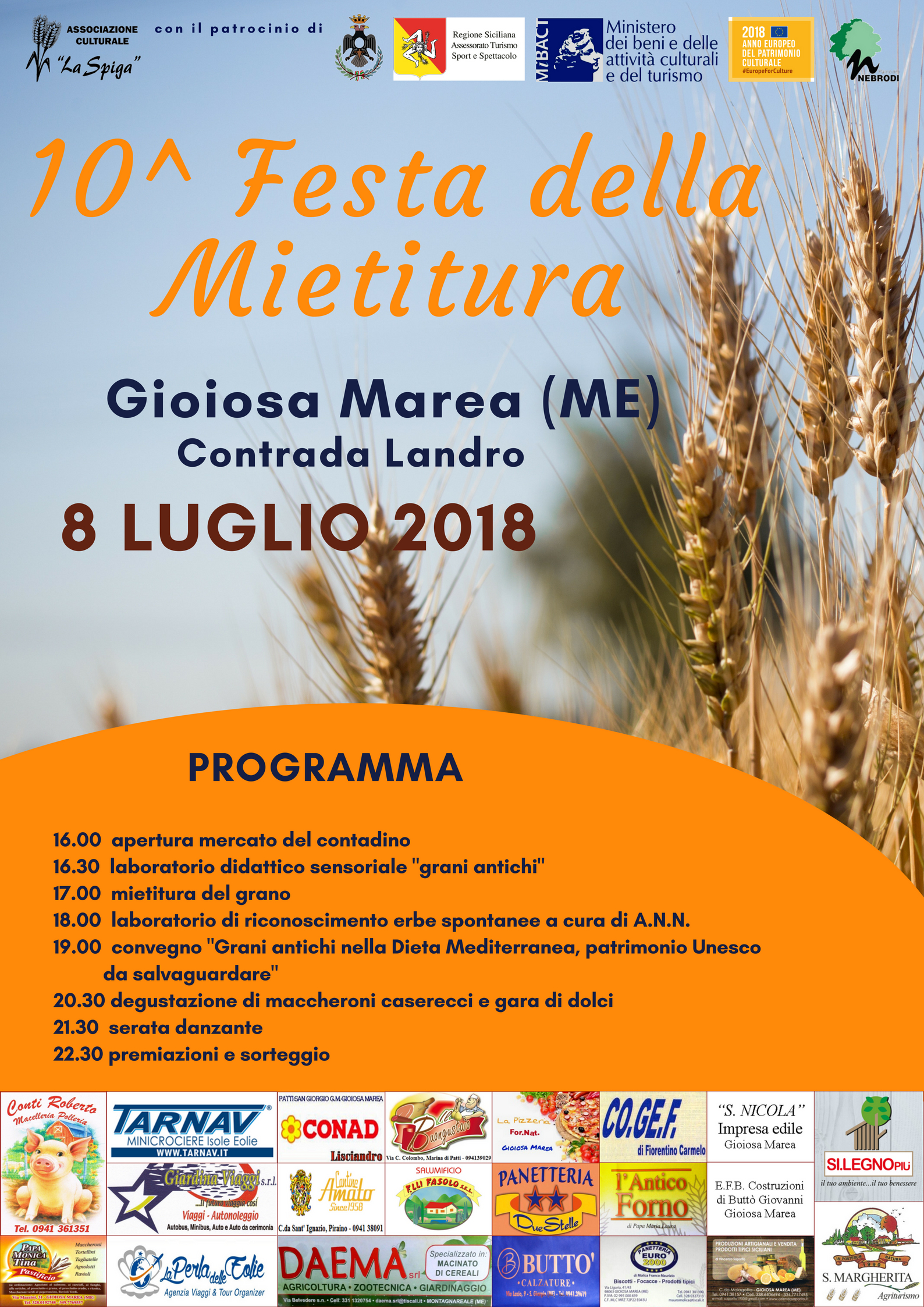 Torna domenica 8 luglio, con la 10° edizione, la “Festa della mietitura” sulle colline di Gioiosa Mare. Nei campi della contrada Landro, a pochi chilometri da Patti e dall’abitato di San Giorgio di Gioiosa Marea, si rivivrà quello che era un vero e proprio rito: la mietitura del grano accompagnata da giochi, musica e canti, con la raccolta a mano come veniva effettuata fino agli anni ’50. L’iniziativa, promossa dall’associazione La Spiga, ci porterà a rivivere per il decimo anno consecutivo i momenti di vita agreste legati alla mietitura del grano, con la partecipazione attiva alla raccolta delle spighe, laboratori, degustazioni di prodotti tipici locali, il mercatino dei prodotti tipici e dell’artigianato tradizionale, musica e flolklore con il gruppo folk Il Meliuso di Gioiosa Marea.