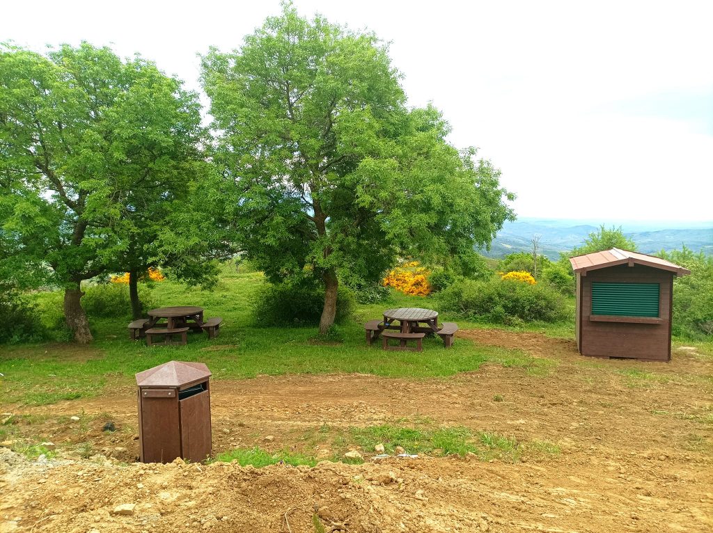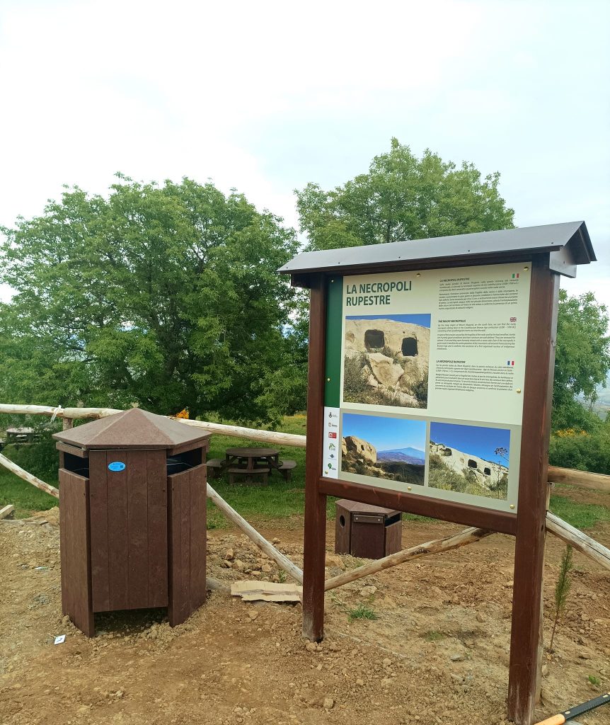 Lungo il sentiero, delimitato da staccionate realizzate in legno, per rendere maggiormente confortevole e fruibile il percorso dei visitatori sono inoltre stati collocati una serie di arredi in plastica riciclata, consistenti in sdraio, tavoli da pic-nic e punti di ristoro, oltre a un’apposita segnaletica informativa, con il tracciato del percorso fino alla vetta del Monte dove, oltre a visitare la necropoli preistorica, si potrà anche usufruire del punto di osservazione astronomica certificato da Astronomitaly come “Cielo più bello d’Italia”.