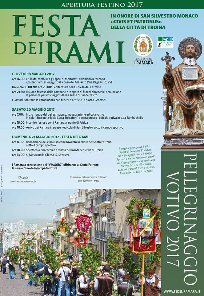 Questa sera al via i festeggiamenti in onore di San Silvestro con la “Festa dei Rami”. Dal 18 al 21 maggio, e nelle successive settimane, la comunità troinese sarà animata dal rullo dei tamburi e dal grido “Viva Diu e San Suvviestu e lu Patriarca San Giusieppi e lu Santissimu Sacramientu” .